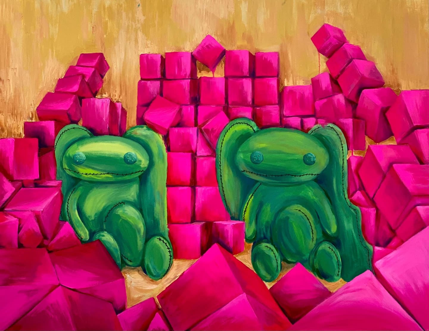 토끼인지 곰인지 알 수 없는 인형들은 어디를 바라보는지 공허한 눈빛으로 정면을 응시하고 있다. 배경에는 박스가 규칙적으로 촘촘히 쌓아 올려져 있다. 그 사이에 인형 두 마리는 마치 주인공이라도 되는 것마냥 캔버스 정면에 위치하고 있다. 작가는 박스들의 반복적인 나열이 주는 공포를 조성하고자 하였다. 생경한 컬러를 사용하여 마치 발랄한 분위기를 연출한 듯 하지만하지만, 냉담한 세상 속에 살고있는 우리들의 억압된 상황 을 나타내고자 한다.